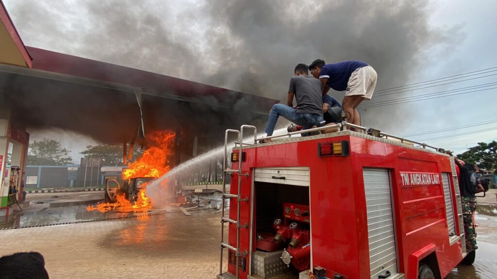 TNI AL. Komandan Kodaeral XI Laksamana Muda TNI Monang H. Sitompul, S.A.P., kembali mengerahkan Prajurit Kodaeral XI beserta unit truk Damkar Kodaeral XI dalam rangka memberi pertolongan dan memadamkan kebakaran pada Stasiun Pengisian Bahan Bakar Umum (SPBU) di Jl. Noari, Kab. Merauke, Prov. Papua Selatan, (17/01).