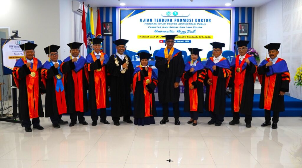 Knews11-Surabaya – Program Doktoral Administrasi Publik Fakultas Ilmu Sosial dan Ilmu Politik (FISIP) Universitas Hang Tuah (UHT) kembali mencetak lulusan doktor. John David Nalasakti Sondakh, S.T., M.M. resmi meraih gelar Doktor Administrasi Publik setelah menjalani sidang disertasi pada Minggu (8/2/2026) di Gedung Pascasarjana Universitas Hang Tuah lantai 5.